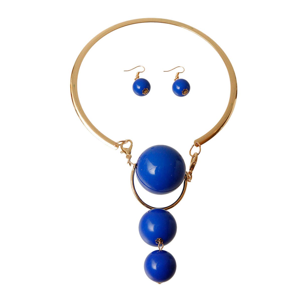 Our Royal Drop choker necklace set features a rigid gold metal wrap collar with a luxurious chunky blue acrylic triple ball drop pendant. The top ball has a hinged design and double lobster clasp closure for a secure fit. Includes matching fishhook ball bead drop earrings.