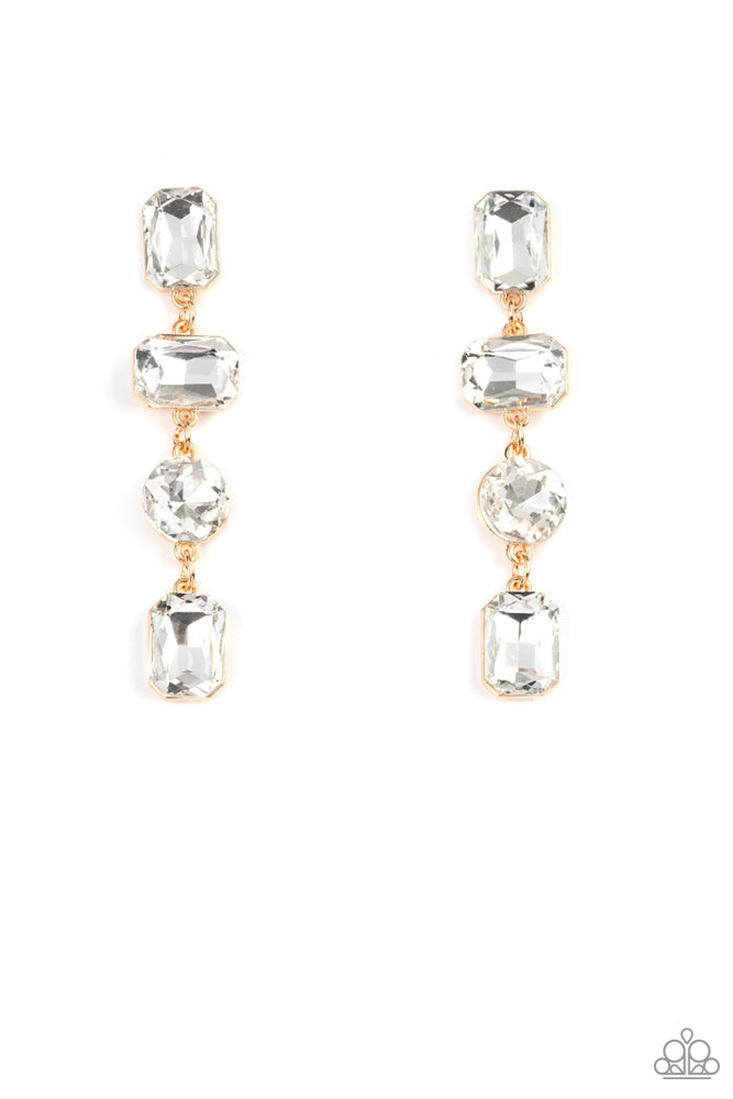 A strand of oversized round, teardrop, and emerald cut white rhinestones trickles from the ear, creating a jaw-dropping golden chandelier. Earring attaches to a standard post earring.