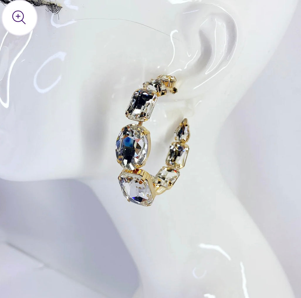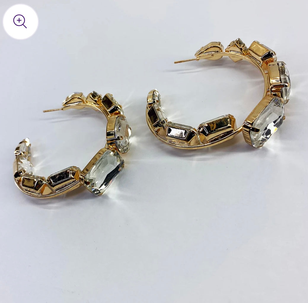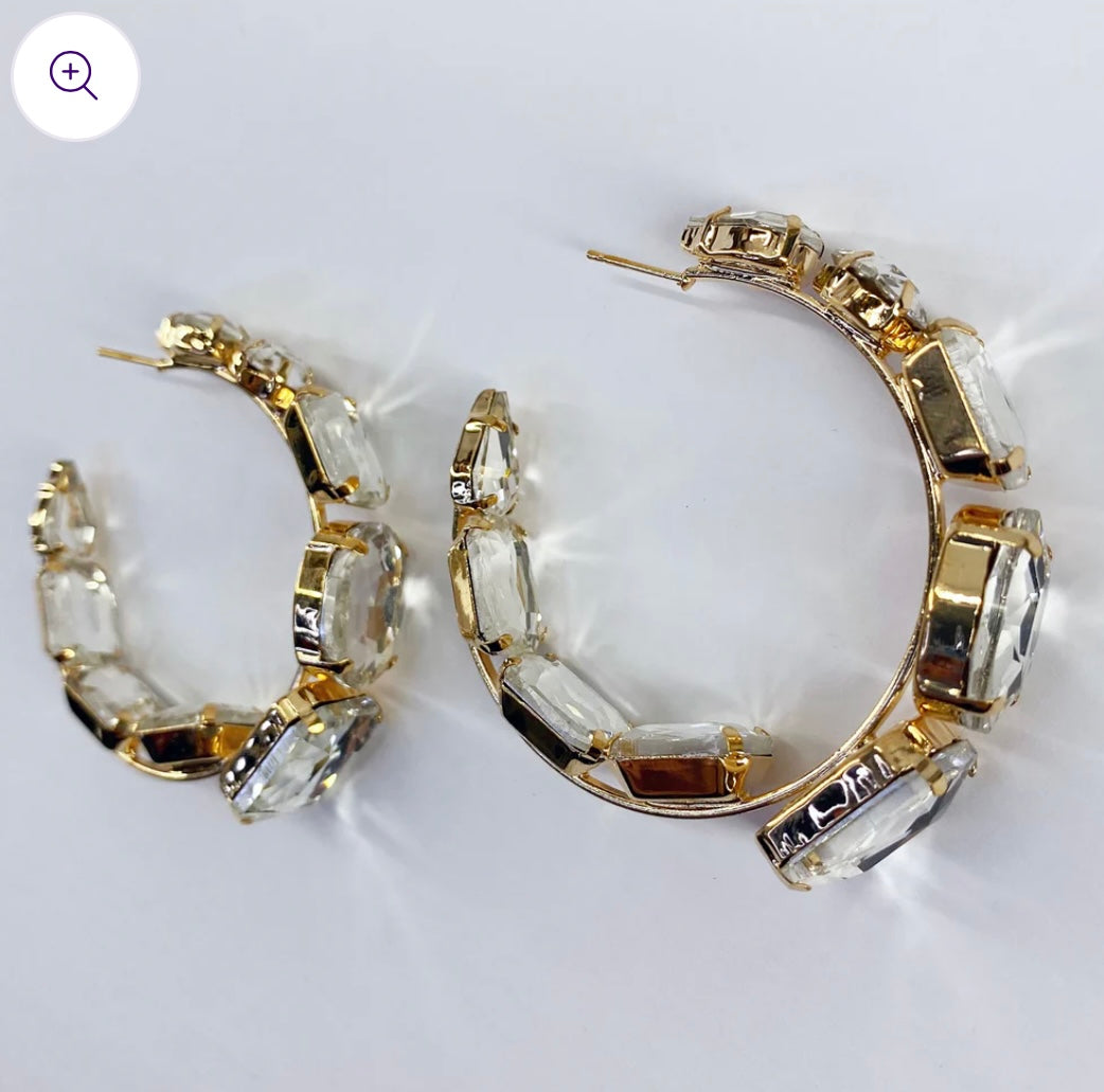 Chunky rhinestones adorn the outer edge of the top half and the inner edge of the bottom half of these hoops. They feature a bold, oversized design in a warm gold tone.