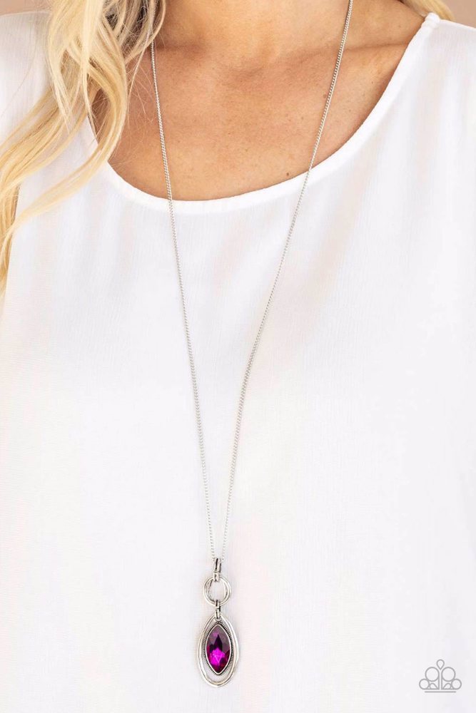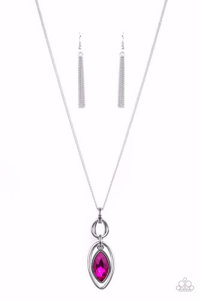 A pink marquise cut rhinestone pendant swings from the top of an airy silver frame that interconnects with a series of mismatched silver links at the bottom of a lengthened silver chain for an elegant finish. Features an adjustable clasp closure.