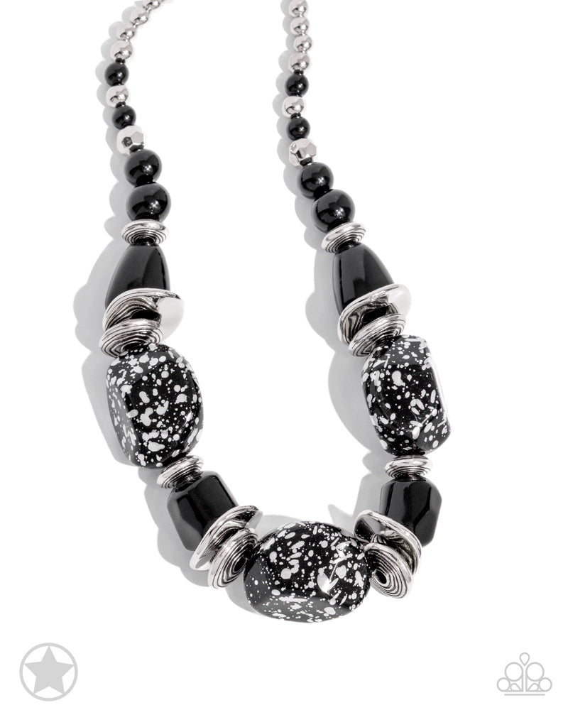 Infused along an invisible string, a collection of abstract chunky black beads with speckles of silver and a gorgeous, glazed finish alternates with solitaire abstract black beads, round black pearls, silver beads, doubled layers of thick textured silver rings, and defaced silver beads, creating an eye-catching, engaging display along the neckline. Features an adjustable clasp closure.