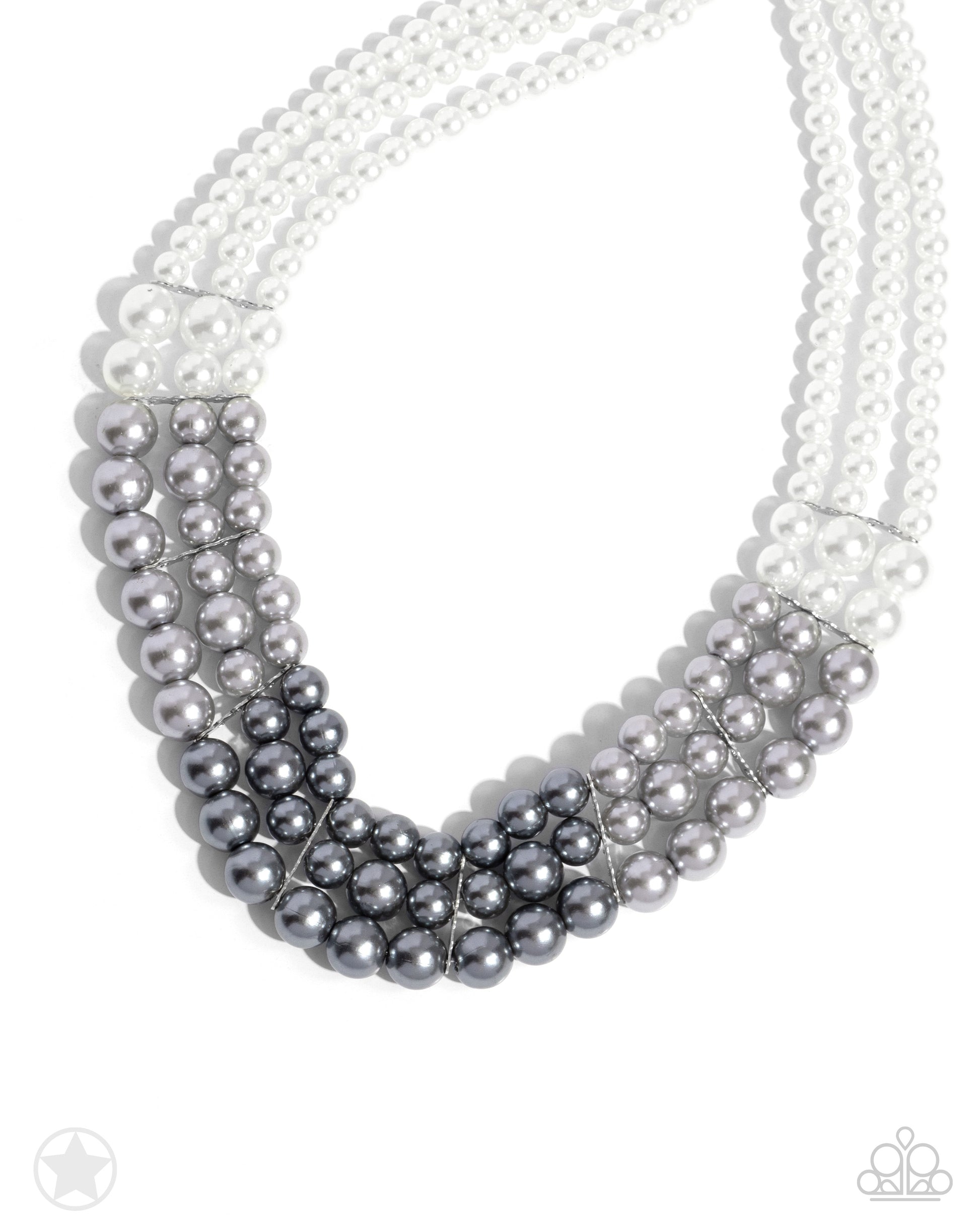 Strands of white, silver, and dark gray pearls elegantly drape below the collar, creating a beautiful ombre effect. Sectioned by silver accents, the luminescent pearls radiantly fall into a glamorous cascade. Features an adjustable clasp closure.