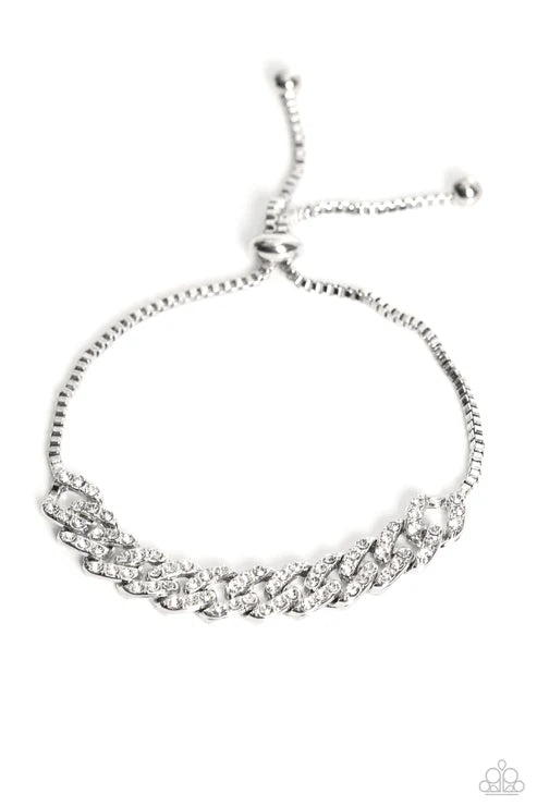 Falling from a rounded silver snake chain, glistening silver links, encrusted with dainty white rhinestones, join across the wrist, creating a bold bracelet. Features an adjustable sliding bead closure.