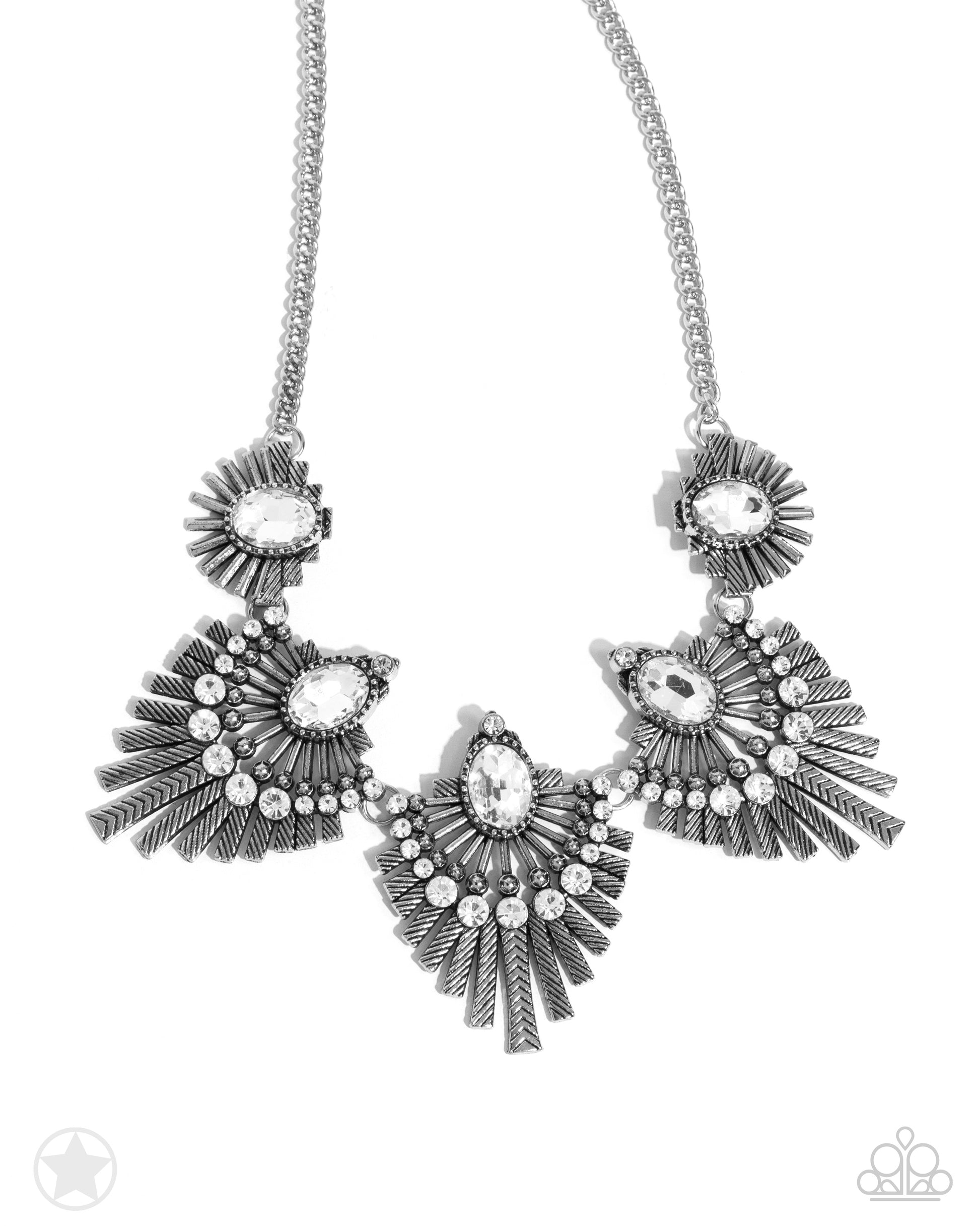 Textured metal bars flare out from a mesmerizing gem, creating a fringe of fanning frames. Sprinkled with matching white rhinestones, the dazzling display falls just below the collar for a sassy finish. Features an adjustable clasp closure.