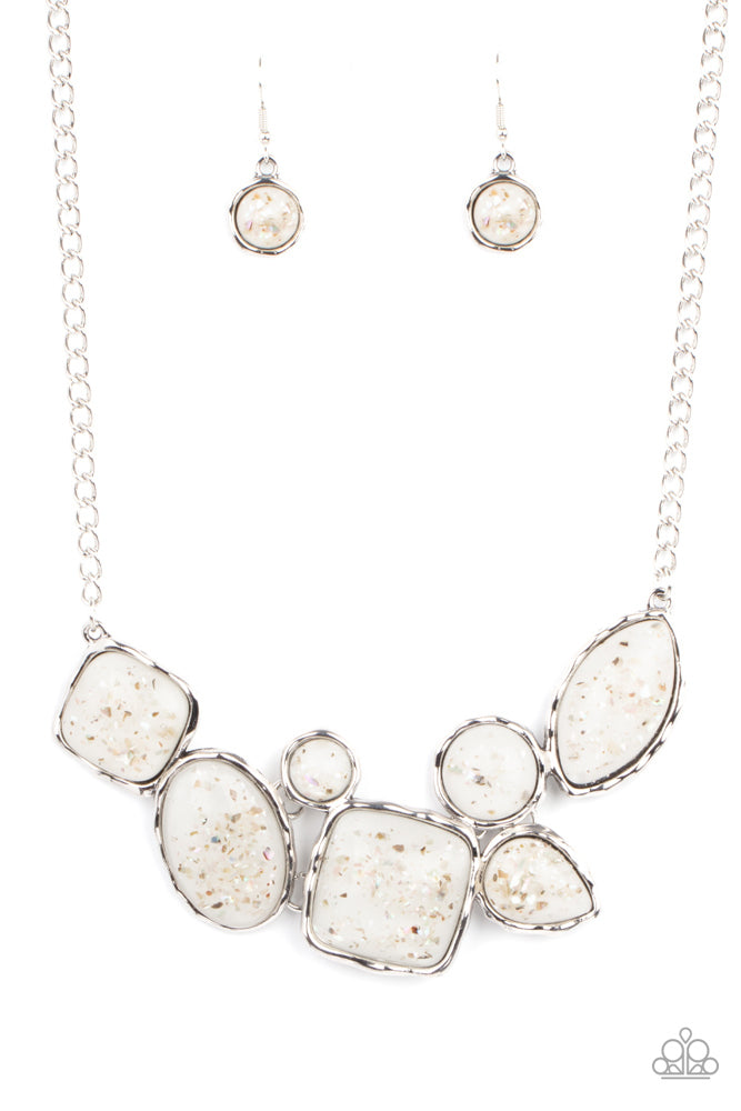 Flecks of iridescent shell-like pieces are encased in glassy white beads. Featuring hammered silver frames, the mismatched frames delicately cluster below the collar for an ethereal fashion. Features an adjustable clasp closure.