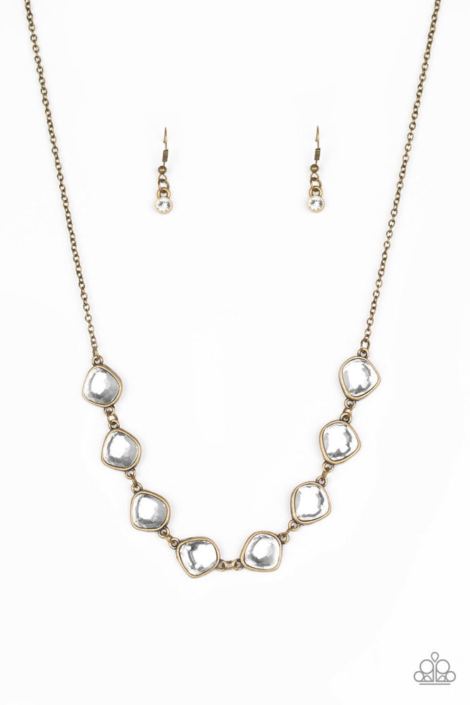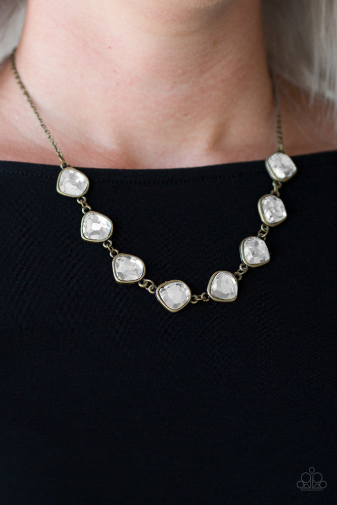 Featuring antiqued brass frames, imperfect glassy white gems link below the collar for a glamorous vintage inspired look. Features an adjustable clasp closure.