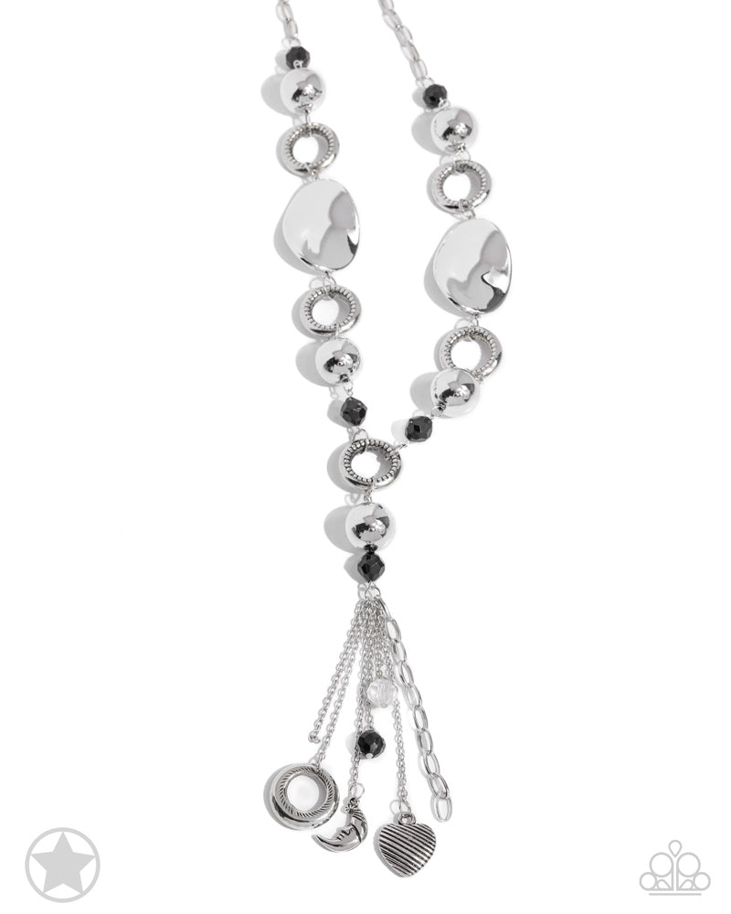 Connected to an elongated silver paperclip chain, a collection of round silver beads, textured silver rings, defaced smoky beads, and curved plates of silver connect and lead down to an additional textured silver ring. A tassel of various silver chains, a crystal-like bead, a defaced smoky bead, and textured charms, including a crescent moon, heart, and ring give way from a silver bead and solitaire defaced smoky bead, creating an eclectic, extravagant extended pendant.